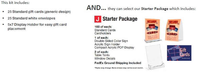 To get started with our Gift Card Program quickly, new Gift Card merchants receive a Welcome Kit.